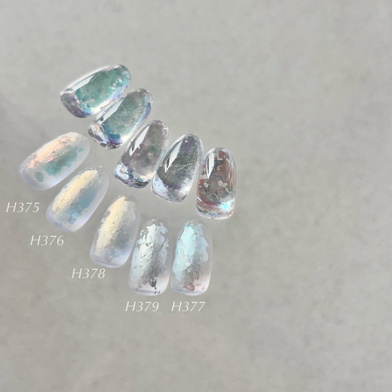 クリスタルプリズムフレーク H375 クリスタルプリズムフレーク(アイス) H376 クリスタルプリズムフレーク(ハニー) H377 クリスタルプリズムフレーク(フレア) H378 クリスタルプリズムフレーク(フローライト) H379 クリスタルプリズムフレーク(クリスタルスモール) ※クリスタルスモールは他のカラーと比べフレークが若干小さめとなります。 "輝きの強いクリスタルオーロラフレーク。 大きめサイズのフレークが、角度によって表情を変え、 一目で惹きつけられる圧倒的な存在感を放ちます。 アートの上に散らすだけで奥行きと立体感が生まれます。 さらに上からシアーカラーを重ねることで、光を内包したような幻想的な仕上がりに。 主役にも、アクセントにも使いやすく、デザインに“ひとさじの魔法”を加えてくれるアイテム。 思わず見入ってしまう、吸い込まれるような美しい輝きを ぜひお楽しみください。" 各種 内容量 0.1g Art work by chiku_nails https://www.instagram.com/chiku_nails?igsh=YWRwdW83ejk2am1s ※ご購入前に必ずお読みください。をご確認の上ご購入をお願いいたします。