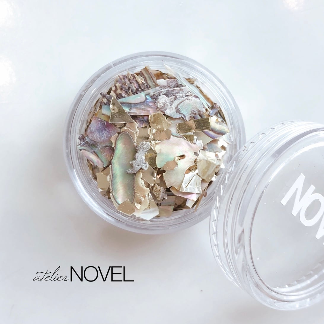 薄くて埋め込みやすく、グリーンを中心としたブルー、パープル、ピンク、ベージュなどの天然の輝きが特徴のシェルフレークとシャンパンゴールドパリンがミックスされています。