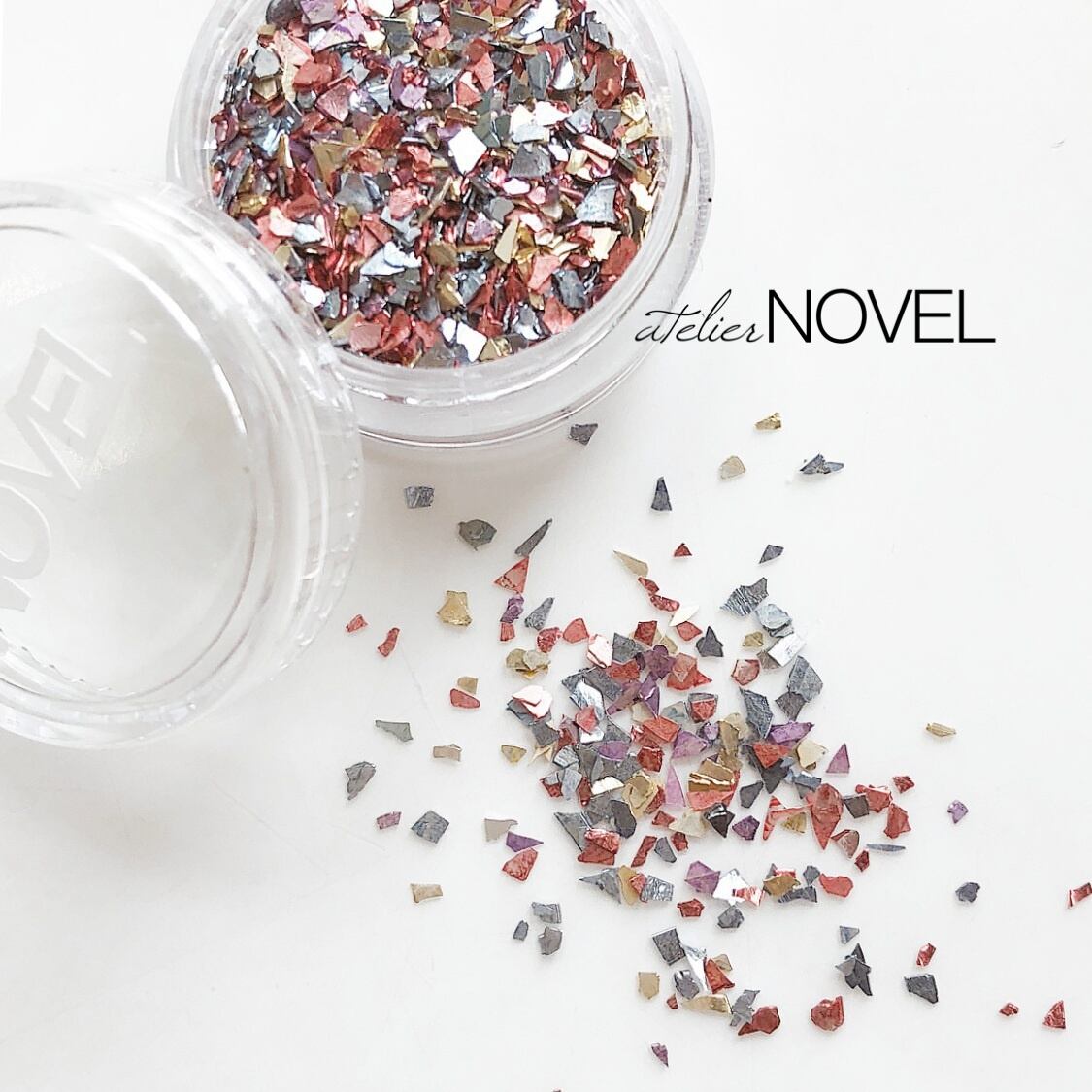 淡く合わせやすい赤、青、金、紫のミックスカラーの薄い金属のフレーク状の埋め込みやすいアイテムです。