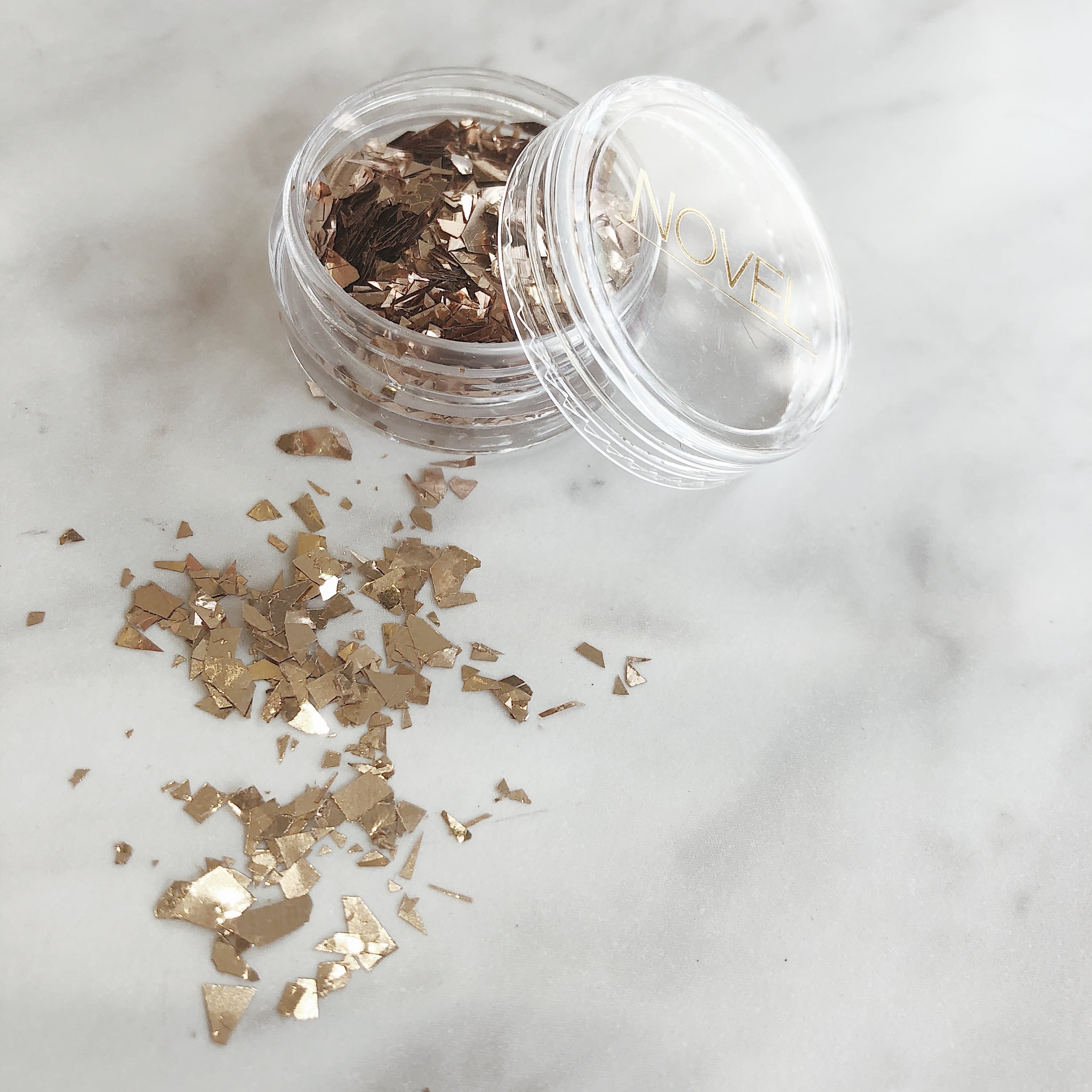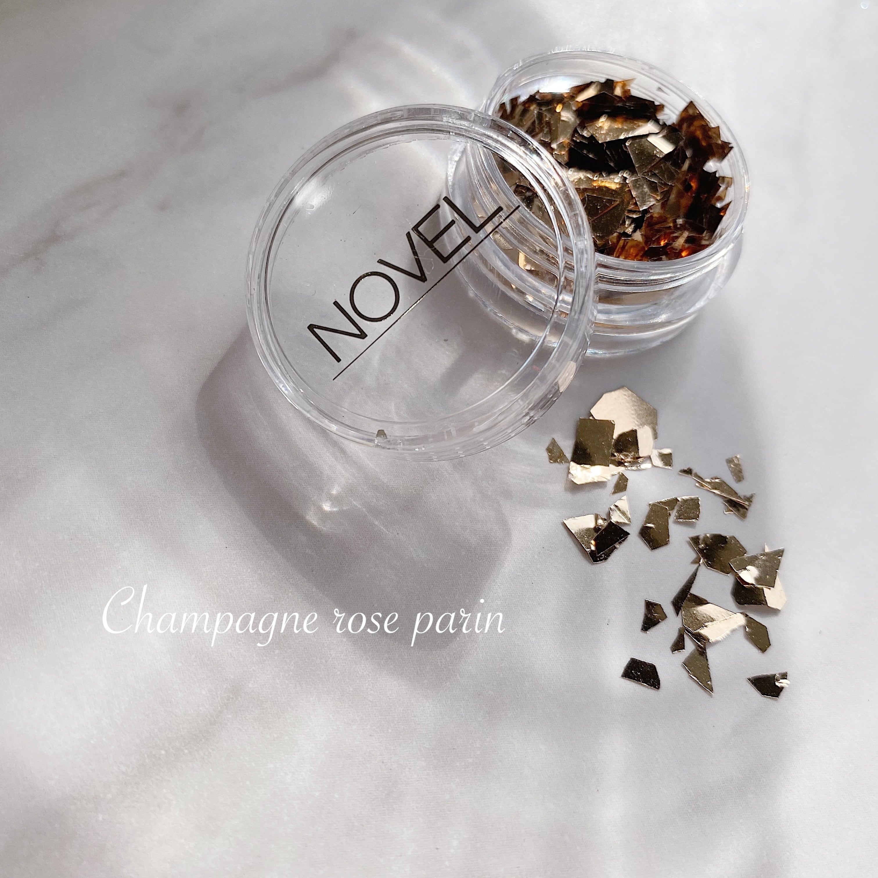 1〜5㎜程度のサイズのシャンパンゴールドとシルバーの乱切りのホロのような質感のタイプになります。