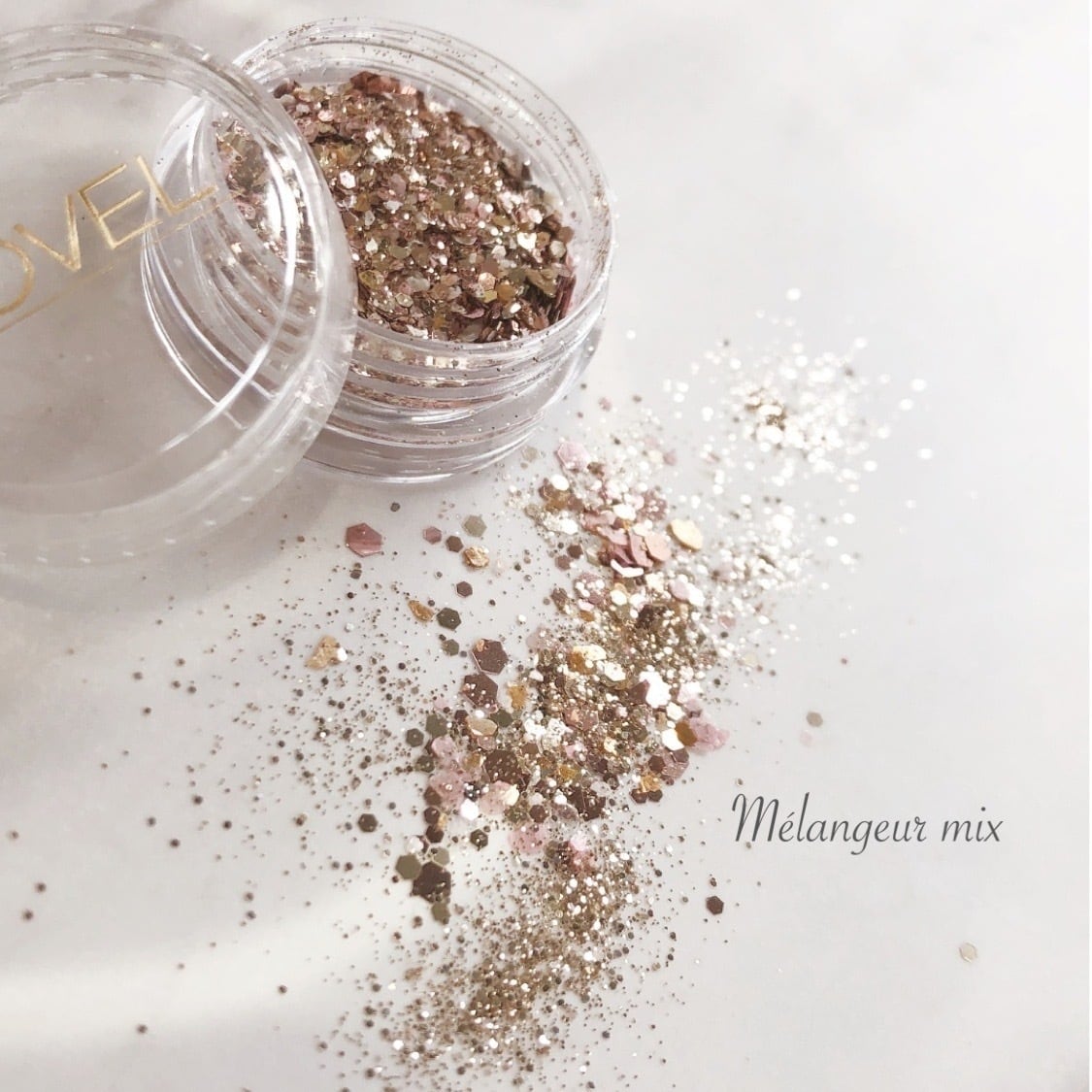 シャンパンや淡いピンクのホロやラメ、シェルの細かなフレークなどがmixされたデザイングリッターです。