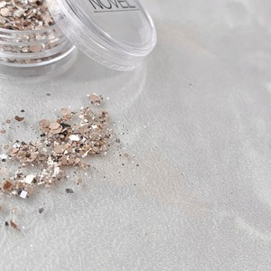 ホワイトとブラックの細かなマイカフレークやマットシャンパンのホロがアクセントとなるグリッターです。